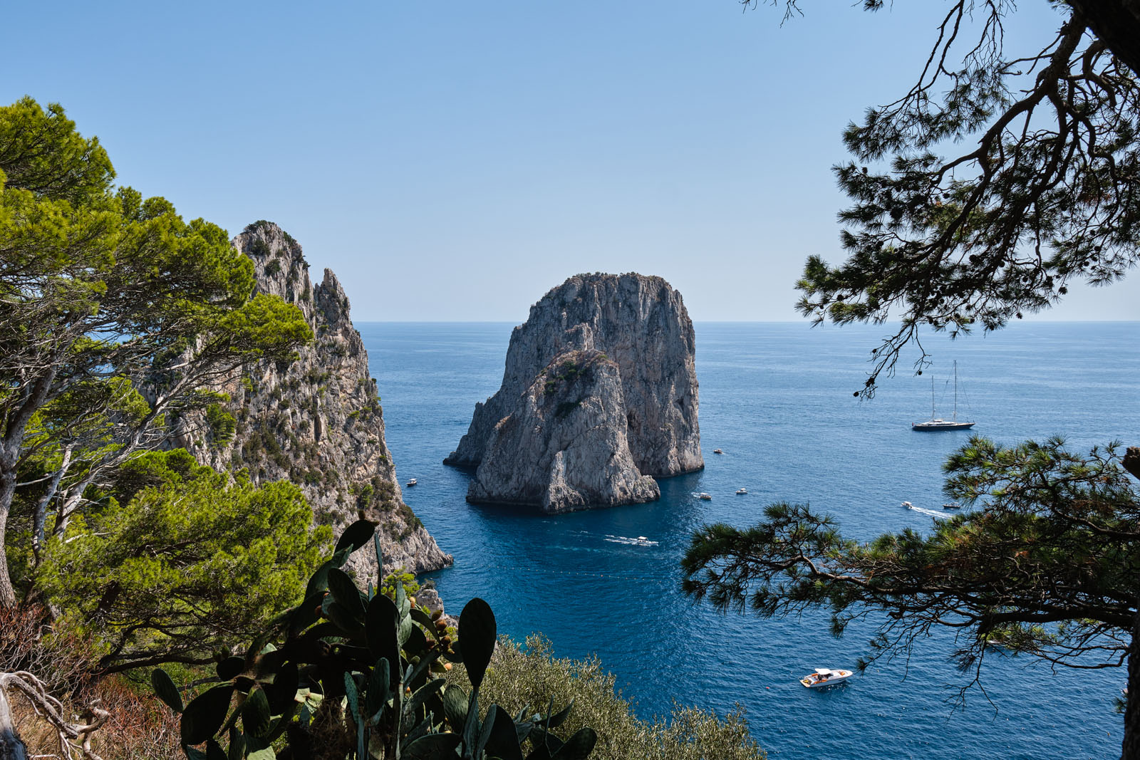 Raggiungere La Fontelina a piedi (Capri è tutta pedonale) dalla Piazzetta è una delle passeggiate (in discesa) più belle dell’isola che percorrono via Tragara fino al belvedere e da lì un sentiero serpeggiante allietato dai profumi della macchia mediterranea.